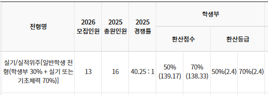 일반학생은 실기점수가 더 중요하긴 합니다만, 작년 입결을 보면 (9등급제) 70%컷이 2.4였습니다. 이 정도는 5등급제로 1.7 전후라고 보시면 되겠습니다.
